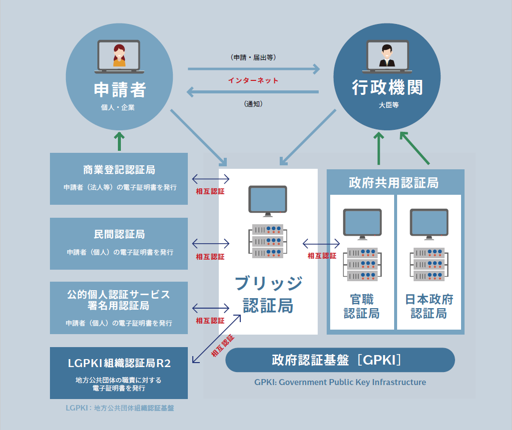 国民等から行政機関への申請・届出等手続をインターネットで行えるようにするための基盤として、政府認証基盤(GPKI:Government Public Key Infrastructure)が国において整備・運用されています。