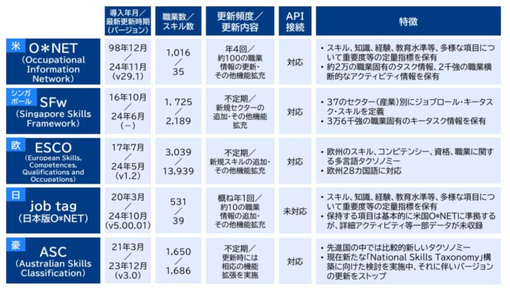 スキルを共通言語化するためには、社会全体として扱うスキルを「スキルタクソノミー」に分解して標準化し整理する必要がある。これは、業界や企業、職業に関するスキル要件を網羅的に一覧化し、分類・体系化するための仕組みのことだ。スキルに関する標準的な辞書をつくると考えるとわかりやすいだろう。例えば米国の労働市場データプロバイダーであるLightcastでは、求人データをもとに、1,900以上の職業分類を整理し、35,000以上のスキル分類を定義し、2週間ごとに更新を行っているという。米国のO*NET、シンガポールのSFw(Singapore Skills Framework)等、諸外国ではスキルタクソノミーの整備が進んでいるが、日本では整理されている職業やスキルがまだ一部に留まっているようだ(図表4)。