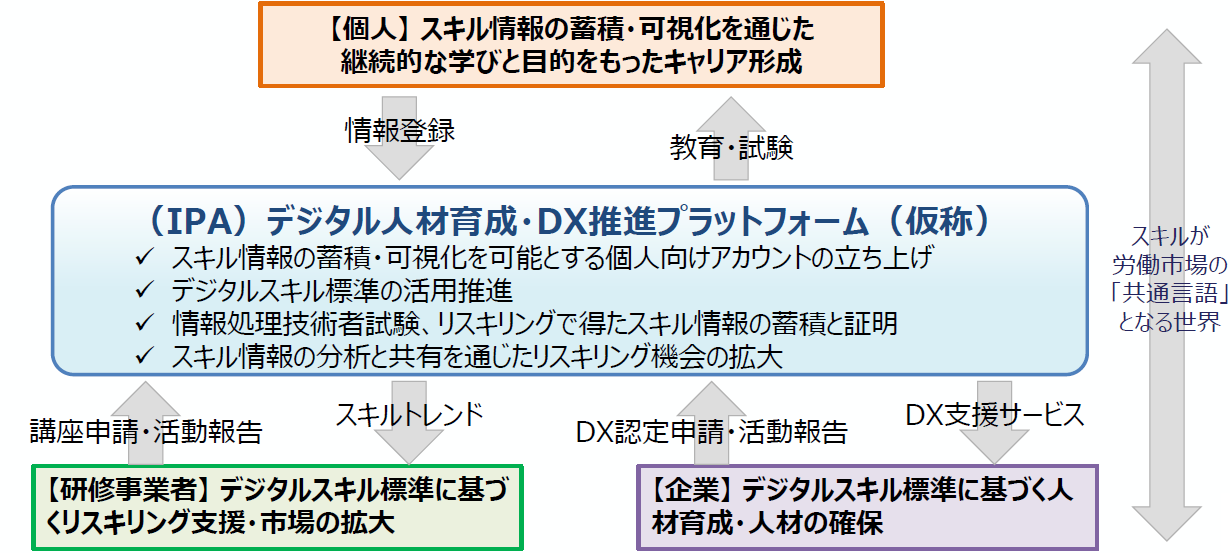 検討会での議論を受けて、日本における個人のデジタルスキル情報を蓄積、可視化し、広く活用するための仕組みとして、IPAが「デジタル人材育成・DX推進プラットフォーム」の検討を開始している。独自のIDを個人向けに付与し、IPAが過去に蓄積してきた情報処理技術者試験やリスキリングによって得られたスキルデータ等を、デジタルスキル標準等の枠組みを使いながら活用する。このプラットフォームでは、①利用者の保有スキルや資格に対してデジタル証明書を発行し真正性を担保する、②利用者のスキルを動的に把握し、目指す人材になるために必要となるスキルをリコメンドする、③市場のスキルトレンドを可視化し、個人の学習や企業の育成方針にインプットする、④利用者コミュニティを形成し、知識共有を行う等といったサービスの提供が想定されている。