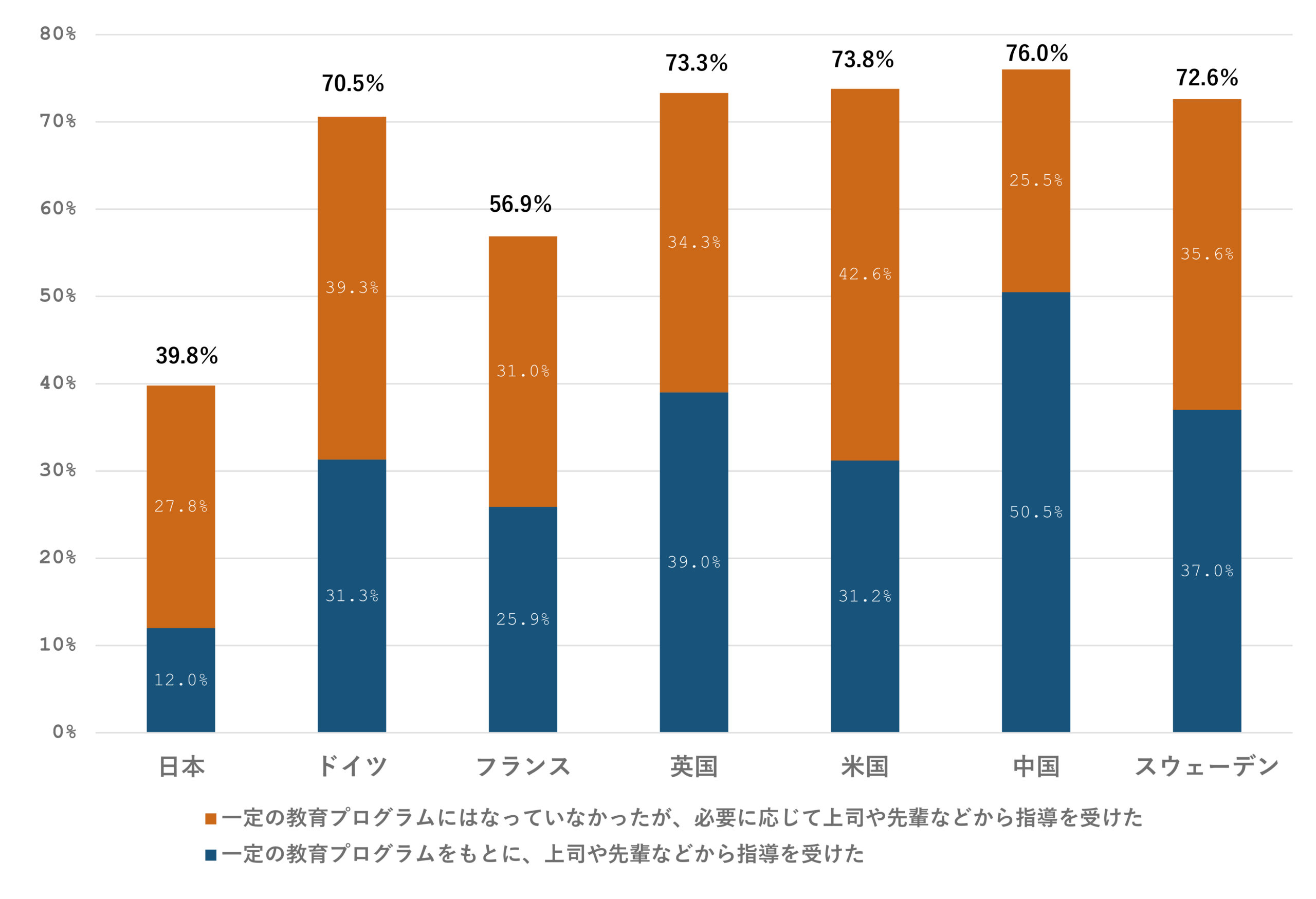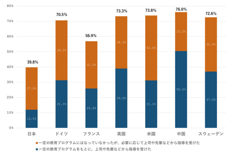 しかし、最近の調査によれば、先進諸国と比較して日本のOJTは必ずしも活発に行われていないことがわかっている。また、OJTの多くは「一定の教育プログラムにはなっていなかったが、必要に応じて上司や先輩から指導を受けた」ものだという[4](図表2)。