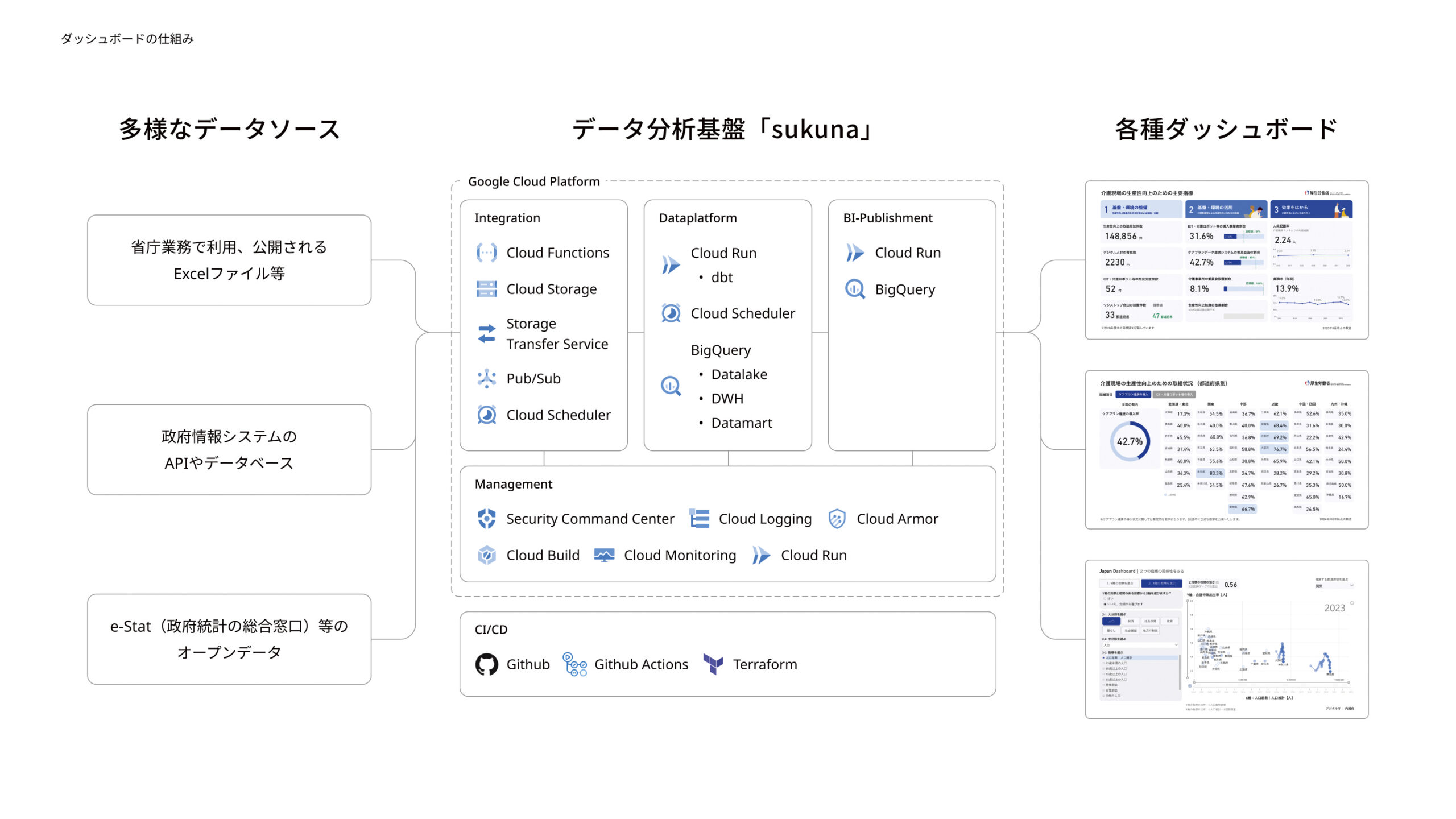 2023年から活動を始め、デジタル庁が中心となり、内閣府、総務省、文部科学省、厚生労働省、国土交通省、子ども家庭庁等、各府省庁と連携してデータの整備、ダッシュボードの開発を行っています。2025年10月現在、経済・財政・人口と暮らしに関する統計情報、行政手続のデジタル化、介護現場の生産性向上、電子処方箋の導入状況、アナログ規制改革等、日本政府として重要な政策分野のデータをダッシュボードとして公開しています。