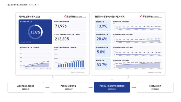このタイプのダッシュボードの一例である「電子処方箋の導入状況に関するダッシュボード」は、政府が推進する医療DXの一環である電子処方箋の普及状況を可視化したものです。電子処方箋は、全国医療情報プラットフォーム実現の重要施策と位置付けられています。