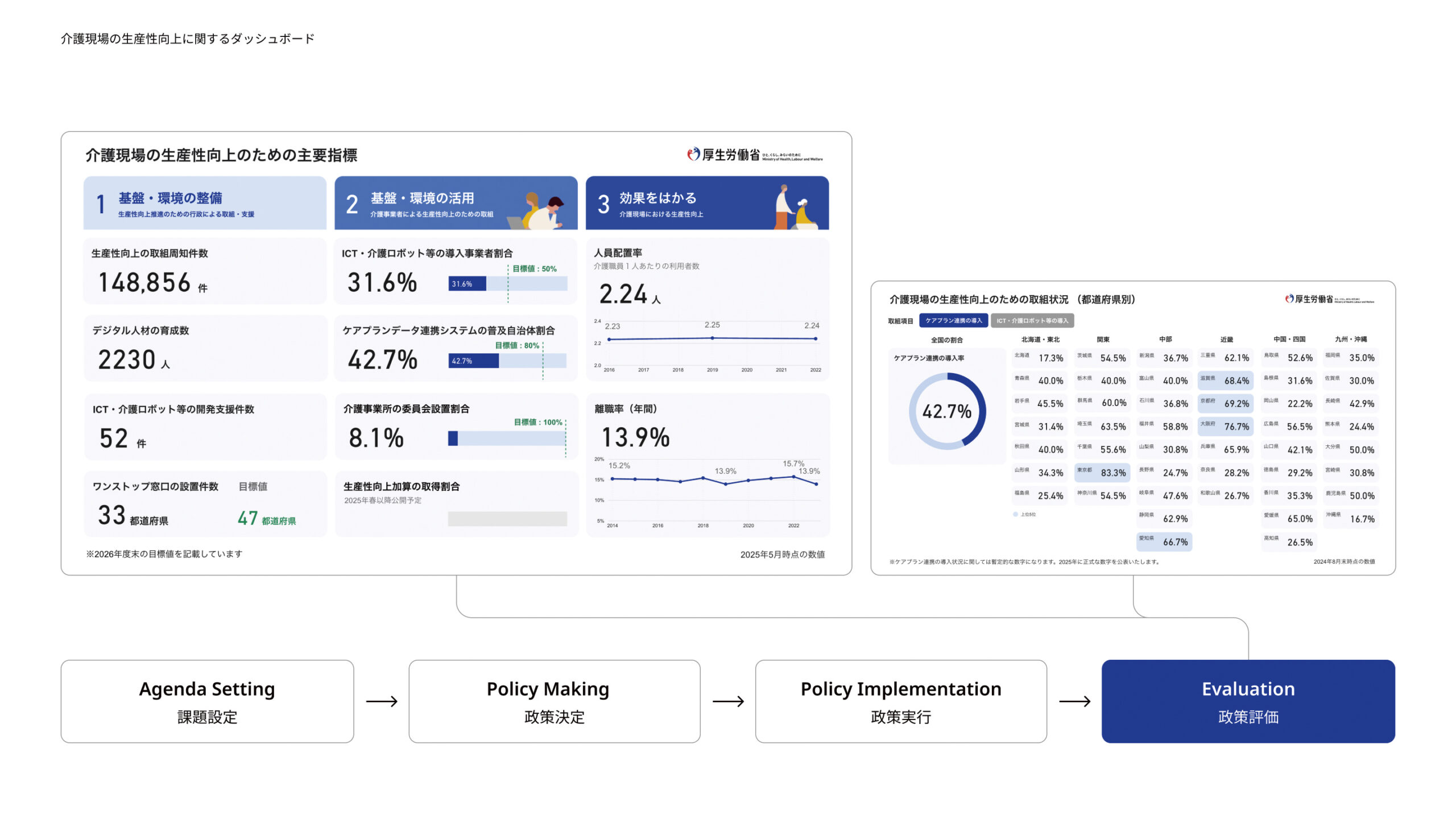 このダッシュボードが担う役割は、生産性向上に関する施策群の効果検証や改善に資する指標の進捗状況をロジックモデルに沿ってモニタリングすることにあります。デジタル人材の育成数やワンストップ窓口設置件数などの「基盤・環境の整備」、ケアプランデータ連携システム普及自治体割合やICT機器・介護ロボット導入割合などの「基盤・環境の活用」、人員配置率(介護職員一人当たりの利用者数)などの「目指す効果」から構成され、それぞれの項目が全国値および都道府県別、推移グラフで示されています。これら複数の指標を包括的に可視化することで、国と各自治体は自らの取組み状況を客観的に把握し、進捗の遅れている地域や課題の残る項目を特定して改善策を検討することが可能になります。データに基づく定期的なモニタリングとフィードバックにより、介護現場でのICT導入促進や業務改善のサイクルをエビデンスに基づいて回していくことが期待されています。