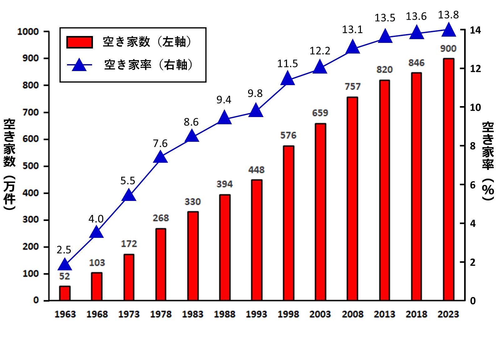図1 日本の空き家数および空き家率の推移(1963年~2023年)