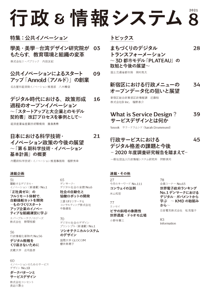8月号全体 会員限定PDF Download 電子版ご購入はこちら(カラーミー) 學美・美學-台湾デザイン研究院がもたらす、教育環境と組織の変革 株式会社リ・パブリック シニアディレクター 内田友紀 会員限定PDF Download 電子版ご購入はこちら(カラーミー) 公共イノベーションによるスタートアップ「Annold(アノルド)」の創業 名古屋市経済局イノベーション推進部 スタートアップ支援室 主任研究員 八木橋信 無償 PDF 表示 デジタル時代における、政策形成過程のオープンイノベーション~「スタートアップと大企業とのモデル契約書」改訂プロセスを事例として~ 経済産業省産業技術環境局 技術振興・大学連携推進課長 瀧島勇樹 会員限定PDF Download 電子版ご購入はこちら(カラーミー) 日本における科学技術・イノベーション政策の今後の展望~「第6期科学技術・イノベーション基本計画」の概要 内閣府 科学技術・イノベーション推進事務局 上席科学技術政策フェロー 堀野秀幸 会員限定PDF Download 電子版ご購入はこちら(カラーミー) まちづくりのデジタルトランスフォーメーション~3D都市モデル「PLATEAU」の取組と今後の展望~ 国土交通省 都市局都市政策課金融税制係長 岡村亮太 会員限定PDF Download 電子版ご購入はこちら(カラーミー) 新宿区における行政メニューのオープンデータ化の狙いと展望 新宿区 総合政策部区政情報課広報係 近藤裕/株式会社B Inc. 代表取締役社長 福野泰介 会員限定PDF Download 電子版ご購入はこちら(カラーミー) What is Service Design?サービスデザインとは何か Snook 代表 サラ・ドラムンド 無償 PDF 表示 行政サービスにおけるデジタル格差の課題と今後-2020年度調査研究報告を踏まえて- 一般社団法人行政情報システム研究所 主席研究員 狩野英司 会員限定PDF Download 電子版ご購入はこちら(カラーミー) 躍動するデジタル・イノベーション(新連載)No.1 「正社員ゼロ」のフルリモート体制で、自動操船ヨットを開発-ものづくりスタートアップ企業のイノベーティブな組織運営に学ぶ エバーブルーテクノロジーズ株式会社 代表取締役CEO 野間恒毅 会員限定PDF Download 電子版ご購入はこちら(カラーミー) 行政情報化新時代No.56 デジタル敗戦をくり返さないために 武蔵大学社会学部 教授 庄司昌彦 会員限定PDF Download 電子版ご購入はこちら(カラーミー) イノベーションのためのサービスデザインNo.10 ダークパターンとサービスデザイン 株式会社コンセント 代表/武蔵野美術大学 教授/Service Design Network日本支部 共同代表 長谷川敦士 会員限定PDF Download 電子版ご購入はこちら(カラーミー) デンマーク・デジタル社会の全貌No.6 社会の自動化と協働ロボットの開発 三菱UFJリサーチ&コンサルティング株式会社 ソーシャルインパクト・パートナーシップ事業部 社会イノベーション・エバンジェリスト 中島健祐 会員限定PDF Download 電子版ご購入はこちら(カラーミー) デジタル社会のデザインプリンシプル(新連載)No.1 ソシオテクニカルシステムのデザイン 国際大学GLOCOM 准教授 櫻井美穂子 会員限定PDF Download 電子版ご購入はこちら(カラーミー) 定期購読のご案内